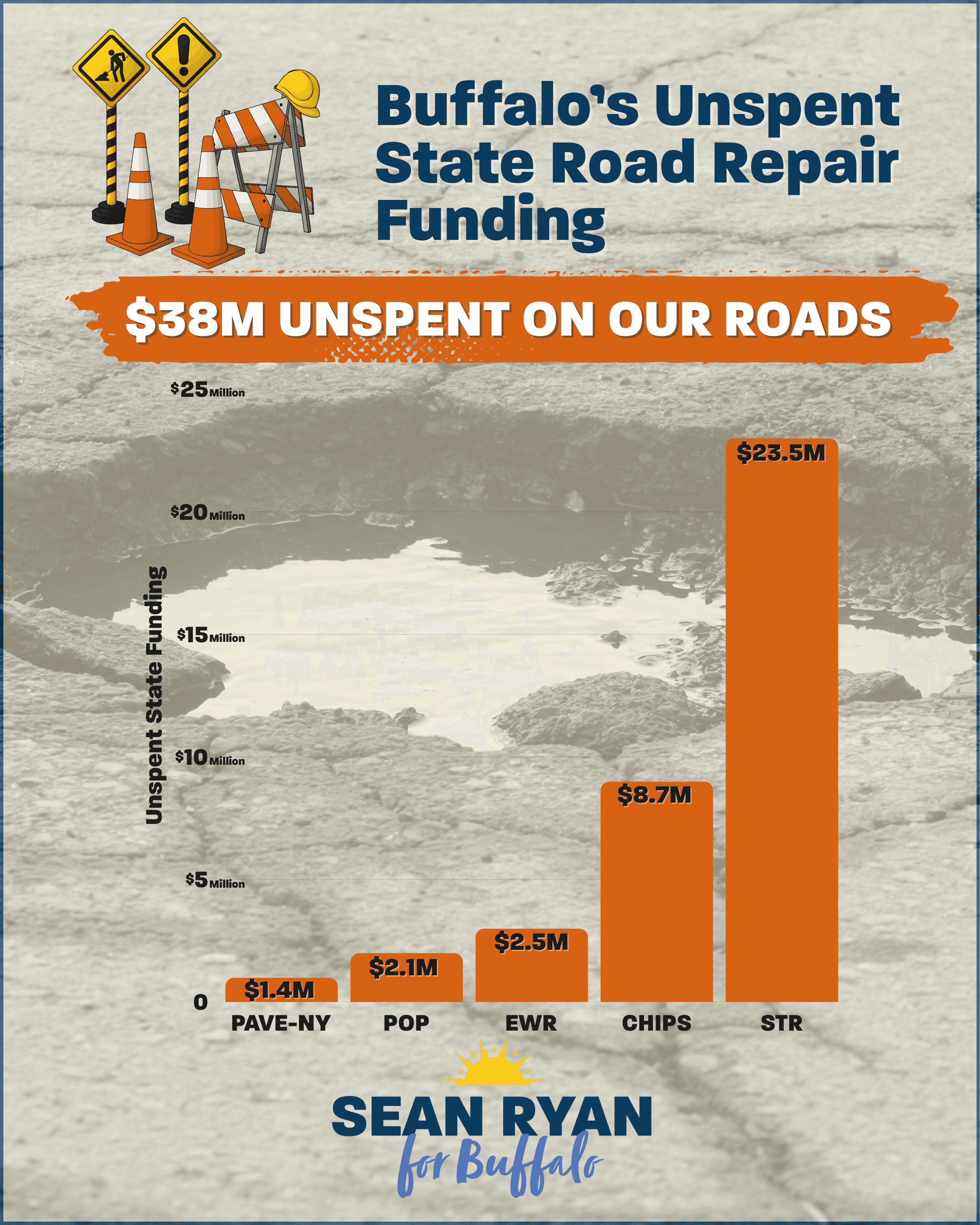 BUFFALO – Today, April 11, 2025, New York State Senator Sean Ryan, the Endorsed Democrat for Mayor of Buffalo, announced plans to tackle Buffalo’s pothole crisis to improve quality of life. Ryan revealed that the City of Buffalo has more than $38 million in unspent road repair funding from New York State. Ryan said that as mayor, he will work to expedite road repair projects so dollars from the state and federal governments are spent as quickly as possible.